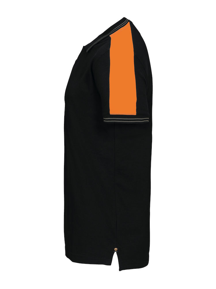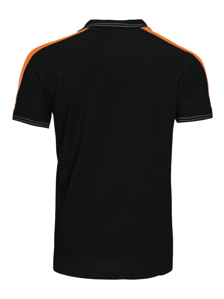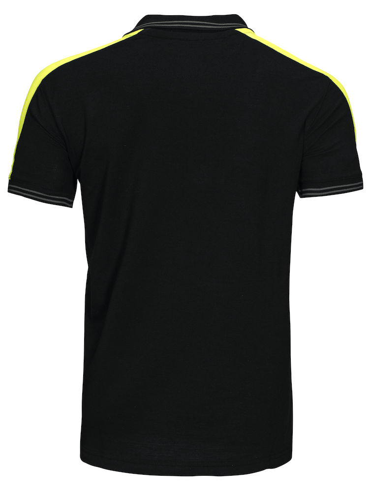 Lyhythihainen pikeepaita. Kaulus ja hihansuut joustinneulosta. Napituslistassa kolme nappia. Olkapäillä fluoresoivaa kangasta.